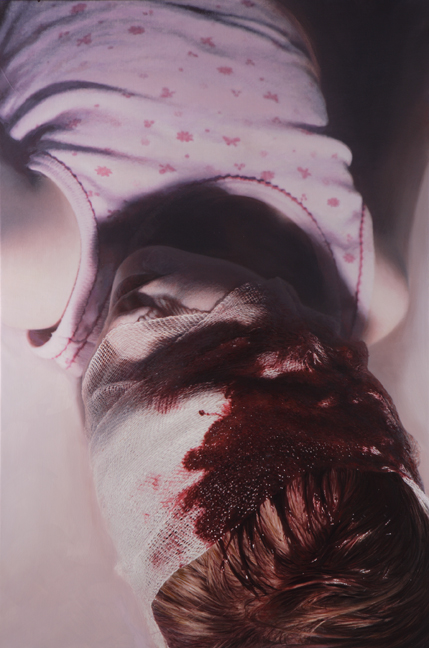 Let’s start with the obvious: Helnwein is one hell of a painter. His massive, photo-like pictures of vulnerable children are breathtaking, both in the often disturbing nature of the imagery and in the artist’s virtuostic ability to mimic life with pigment (a mixture of oil and acrylic) and brush. Each bloodied hair seems utterly real; pale, near-translucent skin seems to cover actual flesh, and the eyes of Helnwein’s child subjects are damp and deep. But, while Helnwein is a master painter, his skill serves only to bring his carefully crafted scenes to fruition; it is the artist’s combination of sophisticated brushwork and calculated, provocative imagery that defines his art.