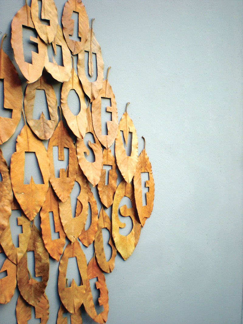 Cordero was then working as a custodian for the Crocker Art Museum. Surrounded by hundreds of works of art, Cordero looked instead at the leaves on the ground. “They looked dried out, but they were flexible,” he says. “I started to think, ‘I could do something with these.’” Cordero began collecting the fallen leaves each day and soon had boxes of them to work with. Inspired by his earlier stencil work he began cutting block letters into the center of each leaf. Soon he was pinning the leaves on blank walls, arranging them to form phrases taken from comments he heard thoughout the day.