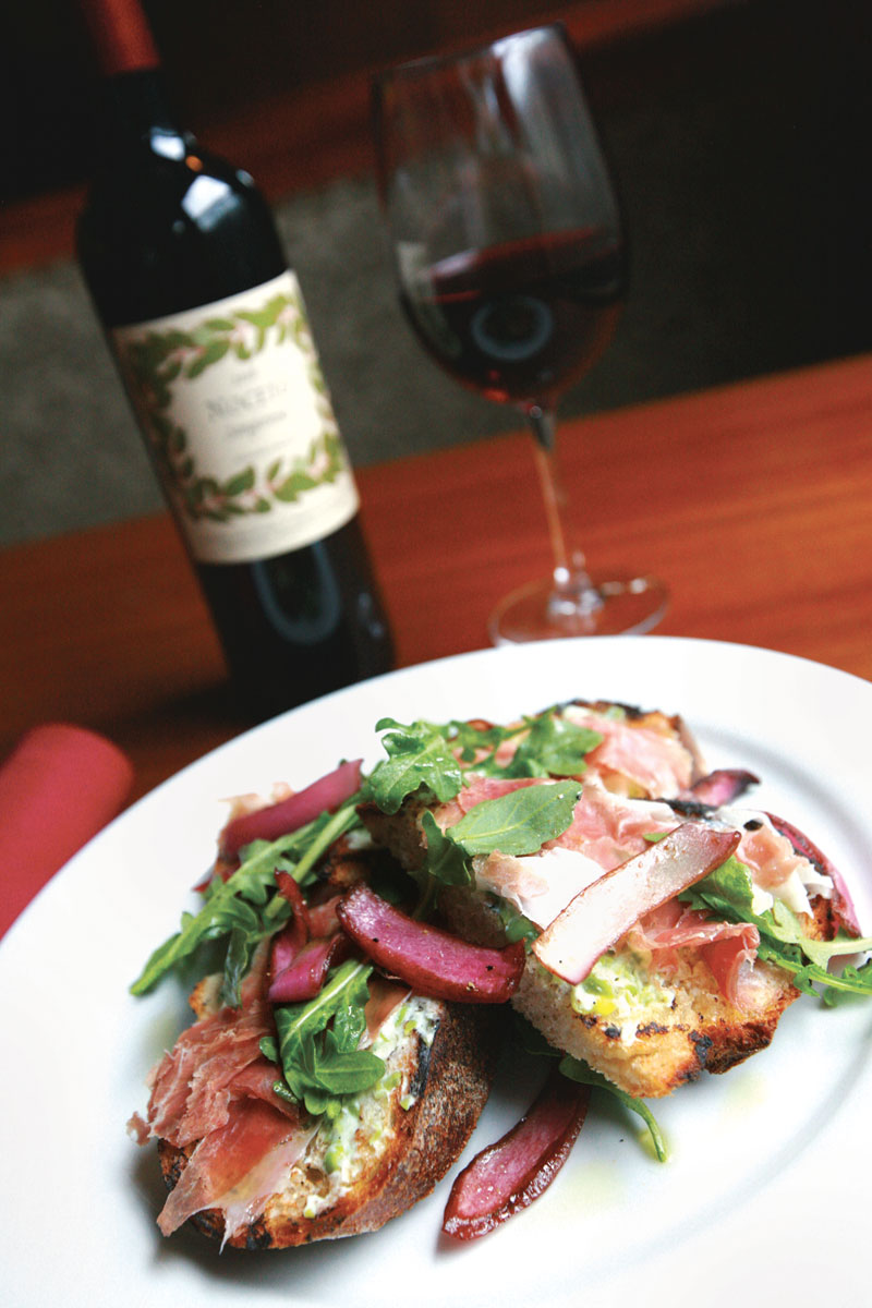 For this seasonal bruschetta, Kupros chef Matthew Robinson wanted to play off of the traditional pairing of peas and, ham, but he knew that if he tried to place peas on a piece of bread that gravity would intervene. His solution was to create a “shmear” of smushed peas and ricotta cheese piled on a slice of lightly charred Grateful Bread. The ham stand-in is prosciutto, and the bruschetta is finished with some balsamic roasted onions and a light drizzle of local Bariani olive oil. It’s an addictive bar bite, available at happy hour and on the late-night menu.