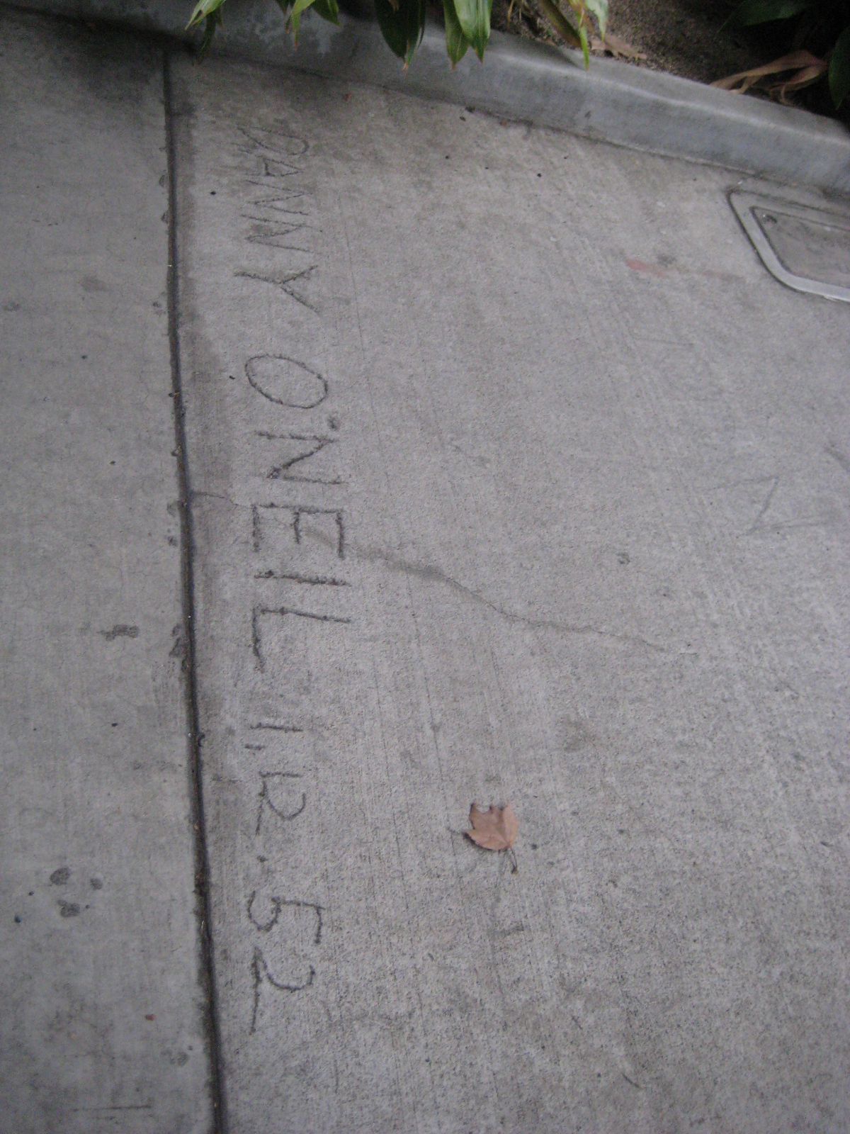 It’s not the easiest thing to take a picture of the sidewalk. It reads “Danny O’Neil 1-12-52” if you can’t read it. Kind of sweet, no?